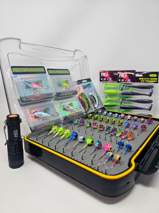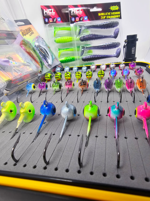 Unleash the power of UV Glow Canadian Walleye jigs with this loaded jig case. HCL's Premium Magnum Double Sided tackle box is perfect to hold thi...